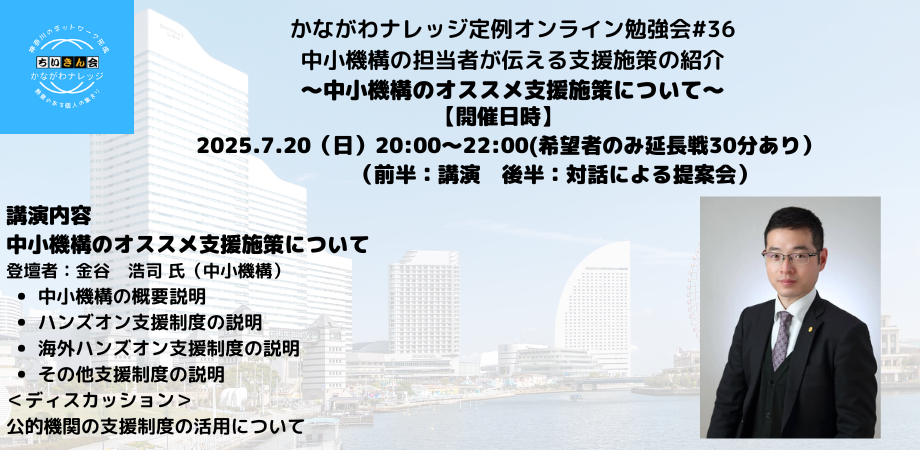 今回は、元信用金庫職員から中小機構に転職した金谷浩司氏をお招きします。日頃から中小企業等のハンズオン支援している経験を活かして、具体的な事例を紹介しながら現場で支援する立場としてオススメする施策を紹介します。官×金×民連携のコミュニティグループを対象に、ノウハウ共有とネットワーク構築の内容になります。かながわナレッジの多様なメンバーによる活動のご参考になりますので、是非ご参加ください。
