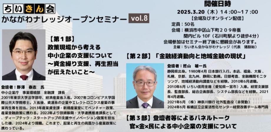 一般社団法人ちいきん会は、約3,000のネットワークまで広がり、全国では16箇所の支部団体が存在し、各地域のために組織の枠を超えた個人の課題解決コミュニティです。かながわナレッジは、神奈川県の支部団体であり、2022年4月からスタートし、現時点で230人超のコミュニティまで広がっております。今回のオープンセミナーは、中小企業庁事業環境部金融課課長の野澤泰志氏をお招きし、中小企業の政策現場を学ぶ会を開催します。また、かながわナレッジのメンバーである鷲山雄一氏からは、金融機関の目線で現場の声等を届ける2本立の場となります。そして、最後には多様な立場によるパネルトークも実施します。多様なメンバーによる中小企業の支援内容やこの場限りの内容など生の声を本音で対話します。なお、会場参加者の方に限っては、セミナー終了後に同会場でご登壇者も参加する懇親会(有料)をご用意しております。是非、この機会にご参加ください。